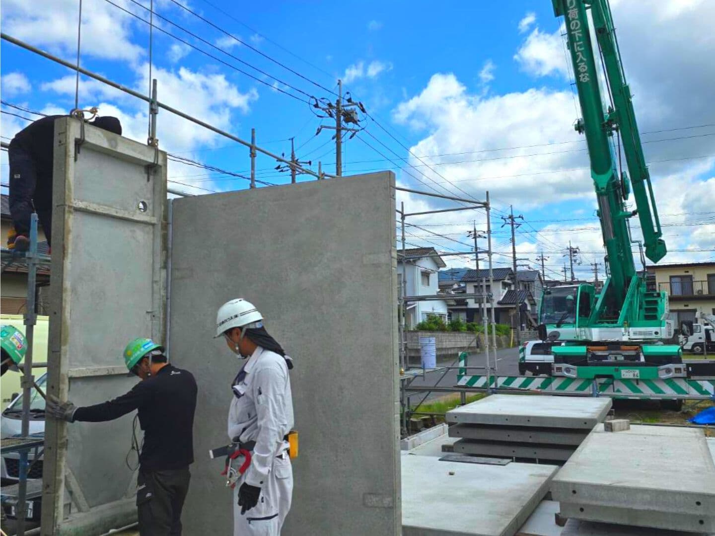 PC建方工事とは、プレキャスト鉄筋コンクリート工法のことで、事前に成形されたコンクリート部材(プレキャストコンクリート)を工場生産しておき、その部材を建設現場に運び込んでつなぎ合わせる工法です。現場では、天候に左右されにくく、型枠作業の減少、工程の簡略化により工期の大幅な短縮を図ることのできる工法です。